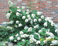 Hydrangea quercifolia, “Oakleaf”, are white blooming and are winter hardy further north than the arborescens. The leaves are shaped like oak leaves. It blooms best where summers are hot, but is hardy further north than the mopheads. They can survive in dry conditions and with little attention. They do not like wet feet and must have excellent drainage to avoid root rot. Oakleaf never need pruning other than to remove dead branches. They bloom in June or July on old wood, forming their flower buds just afterward in August or September. Pruning of 1/3 or more of the branch lengths to reduce size should be done immediately after blooms fade to preserve next years’ bloom, but the shrub grows back so quickly that the pruning is nearly useless. Simply removing the dead flowerheads (deadheading) can be done at any time Up to one third of the old stems may be removed to the ground to rejuvenate an old plant.