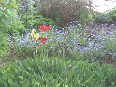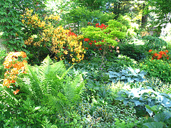 The final part of color design, is developing a plan that will display color when you want it most. If you spend a lot of time at the cabin in the summer, your color display should be focused on spring and fall, utilizing low maintenance plants that will survive neglect when you are away. If you have a pool, your focus may be on the height of summer when you are entertaining and lounging. Most of us long for overflowing displays of blooms from spring to frost. Unfortunately, most plants including annuals, do not bloom for such a long period. So we need to plan for interesting display throughout the gardens at various times of the season. Bulbs that bloom very early, early and late spring, summer blooming bulbs, and fall bulbs, can be tucked in anywhere and everywhere to fill in between bloom periods of your perennials and shrubs. Bulbs should be planned last since they will fit nearly anywhere, even in a very crowded bed. Azaleas, Rhododendrons, Forsythia and lilacs are early bloomers, generally followed by peonies, iris and alliums. But bloom periods for your area and specific varieties can vary quite a bit, so be sure to check. Various flowering perennials bloom for a couple to a few weeks throughout the summer, and annuals are generally at their peak in mid to late summer. Certain varieties of roses may bloom throughout the summer. Cannas bring a bright new display to the gardens in late summer, followed by fall asters and chrysanthemums.