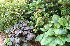 Colored foliage can brighten the landscape and add interest all season. Evergreens of emerald, blue-green or golden supply color and texture even through winter. Certain deciduous shrubs can add a variety of color in large doses. Purple leaf plum is a great purple-maroon backdrop for white, creams and pastels. Daphne, variegated dogwood, and Japanese willow are wonderfully variegated. Heuchera is available in a wide variety of colors from bright greens to deep maroon-purple. Several perennials are grown specifically for their interesting and colorful foliage, blooming may be insignificant. Caladium and Coleus are full of color, from chartreuse to bold fuscia, and are often variegated and textured. Also for the shade hosta varieties, textures and colors are seamingly endless. Lamiums and pulmonaria have interesting speckled spotted or crackled foliage.
