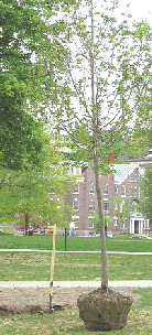 B&B, or balled and burlapped, are dug out of nursery ground and wrapped in burlap until sold. This is the standard means for a tree larger than one that can be kept growing in a container but still can be managed by homeowners or landscapers. (Full grown trees must be dug managed mechanically with a truck mounted tree spade.) It is critical that the root ball not be allowed to dry out. Make sure you are getting a native soil B&B, which means it is wrapped with the soil it originally grew in. The soil and root mass will be quite firm. A “manufactured ball” is dug up, placed on a wrapping, and new soil is added. The soil and root mass, or “ball”, will be quite loose and wiggly. These are extremely difficult to keep moist, and root damage is likely to occur making transplant success less likely.