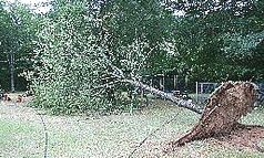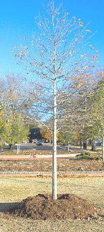 There should be some removed soil left since part of the hole was filled with the tree’s root ball itself. Use this to form a saucer effect around a tree. Build up about a 2 inch dam all the way around to help hold in water to soak into the hole. Then thoroughly soak the tree once a week for the first several weeks. Staking and guying a small tree is not necessary and may damage the tree. A small tree properly planted does not have enough mass to be pulled over by wind. The ties stress the trunk and damage the bark. The tree does not develop good wind resistance strength. As previously mentioned, young trees naturally bend and sway in the wind. And a staked tree is more likely to snap at the point the guys are tied in a strong wind because the tree is not being allowed to move. As long is the tree is less than six feet tall or only one inch or less is diameter, do not stake the tree. Deep anchor roots will establish to hold the tree in the soil.