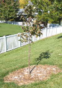 Mulch can be applied to help the tree retain water. Summer mulch should be applied lightly, just enough to cover the soil well. This will not only help the soil to stay moist, but will reduce weeds. The mulch should not be applied directly around the base of the trunk. Additional mulch can be applied just after the ground freezes. A deep layer of mulch, a few to several inches, will help the soil maintain a more constant temperature. Soil that constantly freezes and thaws can cause damage to the roots or even heave the root ball right up out of the ground. Winter mulch should be applied in a “donut” fashion, again not applied directly around the base of the trunk. Trees that are well suited to your region and soil conditions should normally not need winter protection. But if you are planting a marginally hardy tree for your area, protection the first 2 or 3 winters may prevent winter kill while it adapts. Trees planted a bit late in fall might also need mulch to keep the soil warm longer while the roots establish.